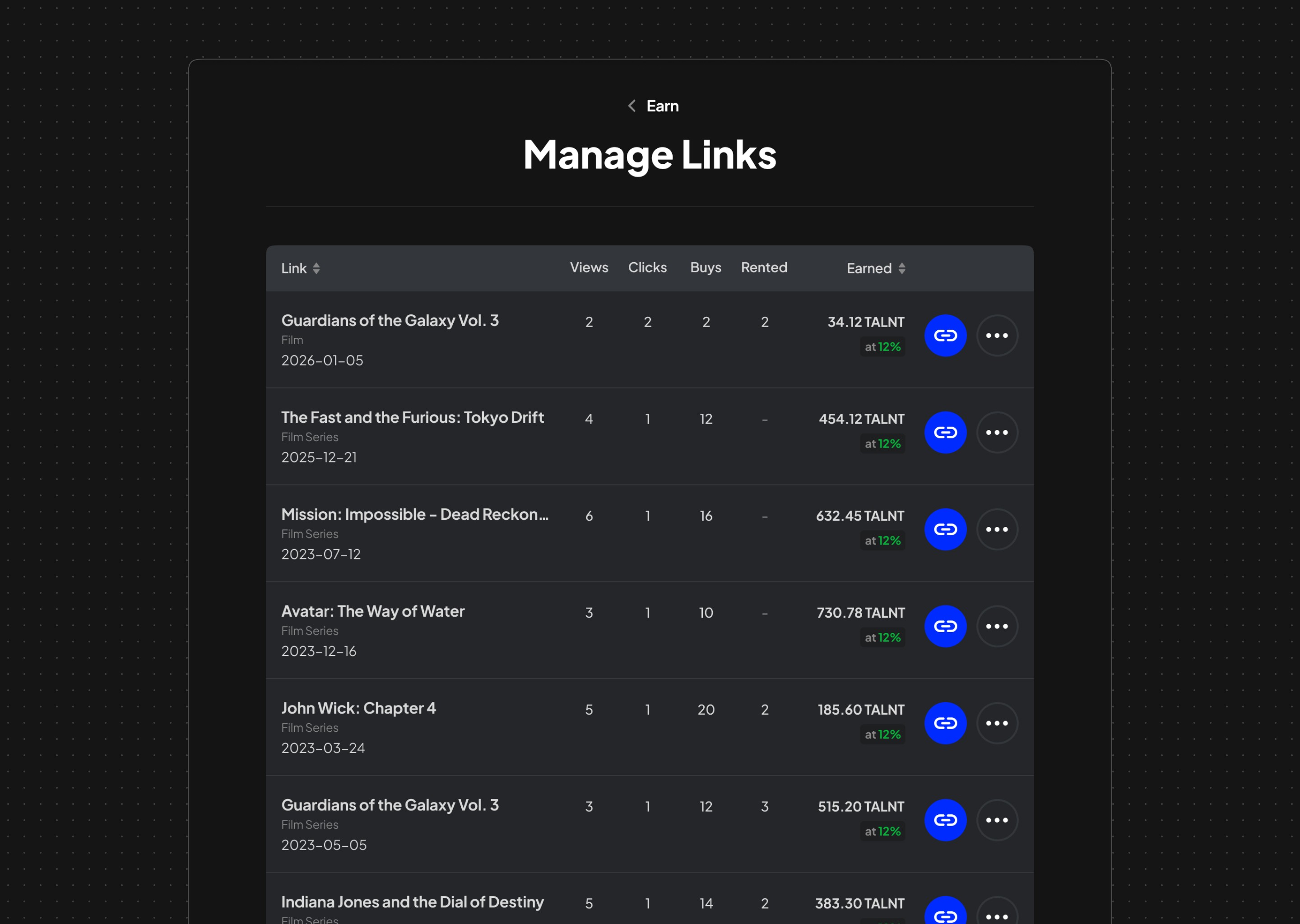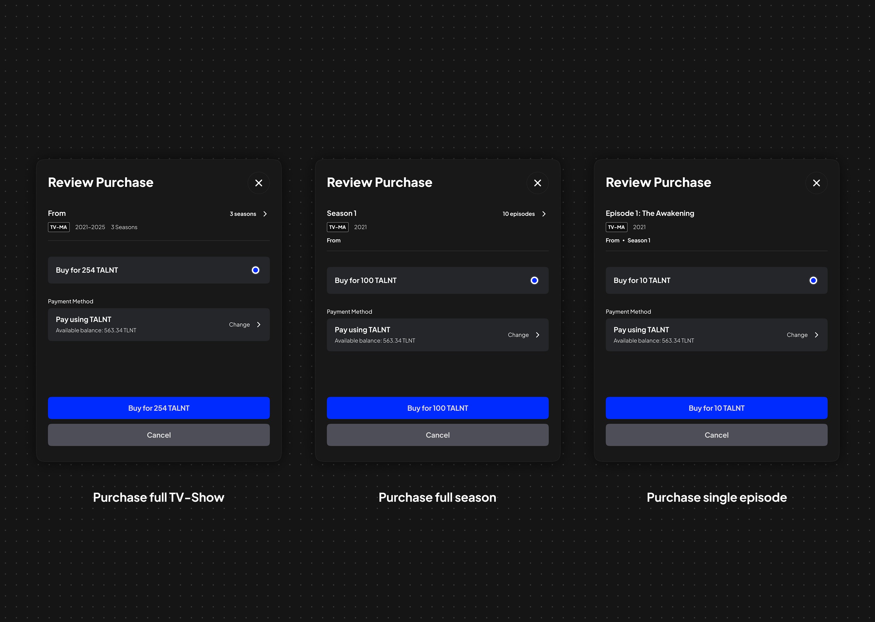 I designed a modular purchase and engagement system that supports buying and renting films, series, seasons, and episodes using both fiat (USD) and native tokens (TALNT). The experience introduces clear ownership semantics, lightweight evaluation tools, and a simple affiliate program that allows users to earn rewards by recommending content.